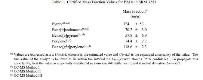 表 1 提供了以干質(zhì)量為基礎(chǔ)報告的選定 PAH 的認證質(zhì)量分數(shù)值。NIST 認證值是 NIST 對其準確度具有最高置信度的值,在所有已知或懷疑的偏差的來源已被調(diào)查或考慮 [1]。 NIST 進行了賦值分析;認證值計算為 NIST 方法平均值的未加權(quán)平均值。相關(guān)的不確定性以大約 95% 的置信水平表示 [2-4]。