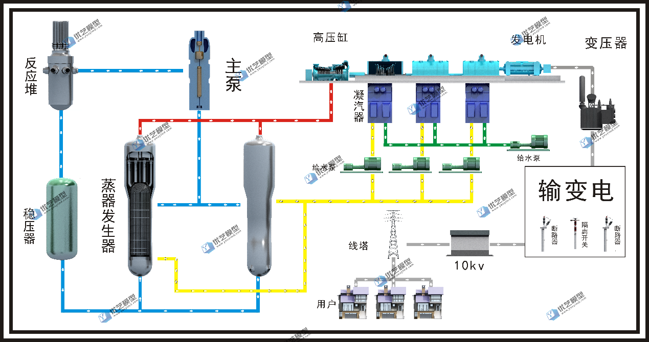 該模型設(shè)計(jì)了15個控制點(diǎn),分別為一次回路;二次回路;汽輪機(jī)檔位1,汽輪機(jī)檔位2,汽輪機(jī)檔位3,隔離開關(guān)1,斷路器,隔離開關(guān)2,電力輸送,10kv變電房,用戶,環(huán)境............等!展現(xiàn)了從核島至用戶的核電產(chǎn)生,傳輸,入戶的完整工藝流程,主要其展現(xiàn)了其中任意環(huán)節(jié)出現(xiàn)安全風(fēng)險(xiǎn)后,帶來的對應(yīng)效果,及備用措施............等!
