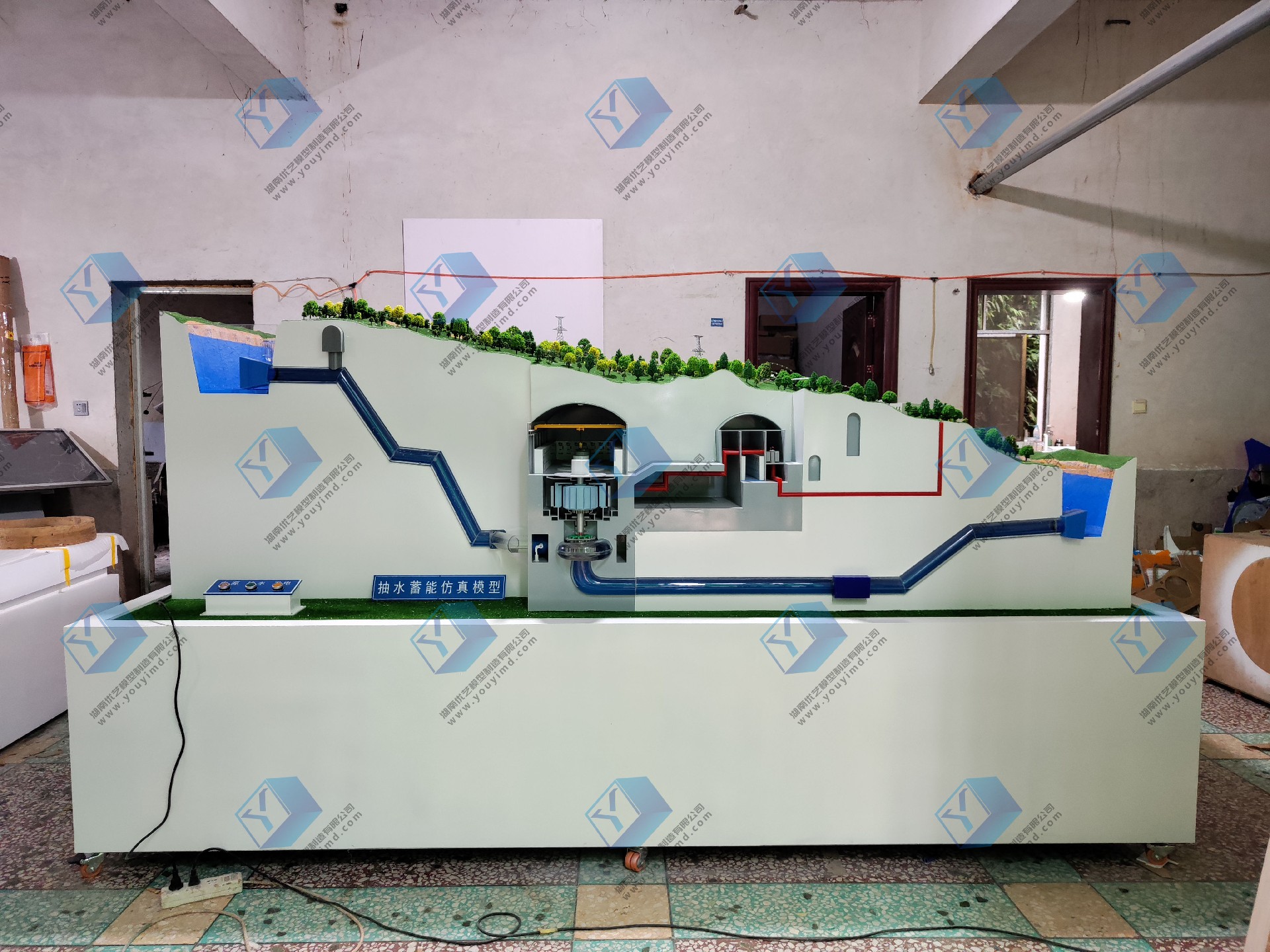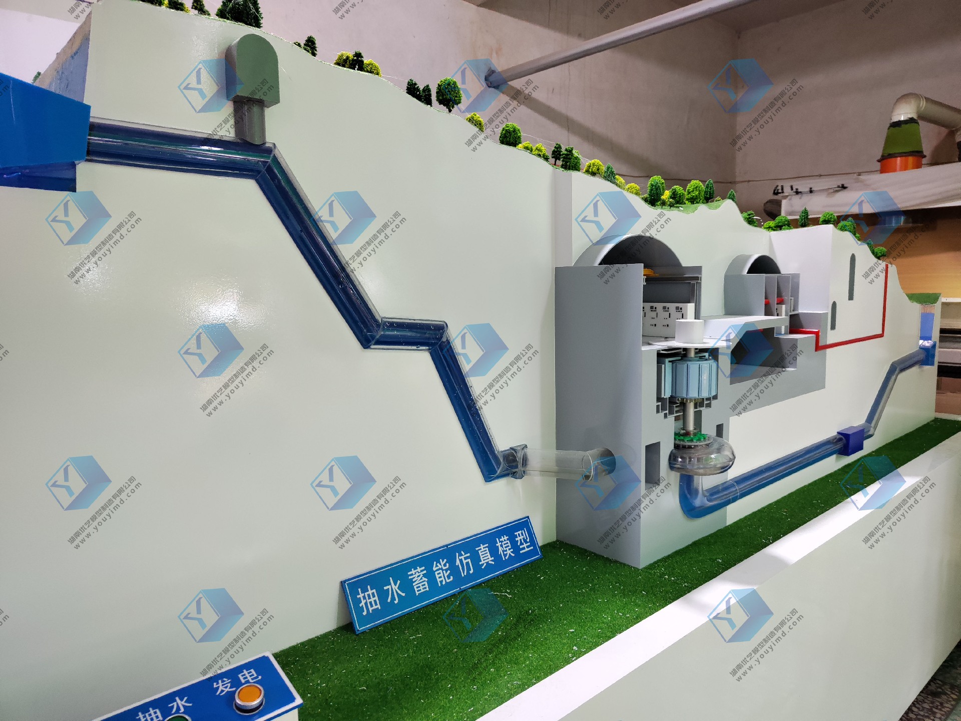 抽水蓄能水電站動態(tài)剖面結(jié)構(gòu)仿真模型, 是湖南省優(yōu)藝模型研發(fā) 、設(shè)計、制作的仿真教學(xué)實(shí)訓(xùn)設(shè)備, 設(shè)備長 4米 寬1.2米。整體采用空面結(jié)構(gòu)展示, 展示出上水位、 地下廠房、水輪發(fā)電機(jī)、下水位、 地面部分制作出山體地形綠化、鐵塔電能輸送線路等。 設(shè)備整體采用真實(shí)過水、 模擬進(jìn)水管道、 渦殼尾水管等采用透明結(jié)構(gòu), 內(nèi)部真實(shí)過水 和LED燈光動態(tài)模擬水流流向 、通過自控技術(shù)實(shí)現(xiàn)抽水原理演示、 發(fā)電原理演示、 實(shí)現(xiàn)水輪機(jī)正反轉(zhuǎn)、水流反向流動 、實(shí)現(xiàn) 抽水蓄能水電站工作原理動態(tài)演示。 適用于教學(xué)實(shí)訓(xùn)科普展覽等