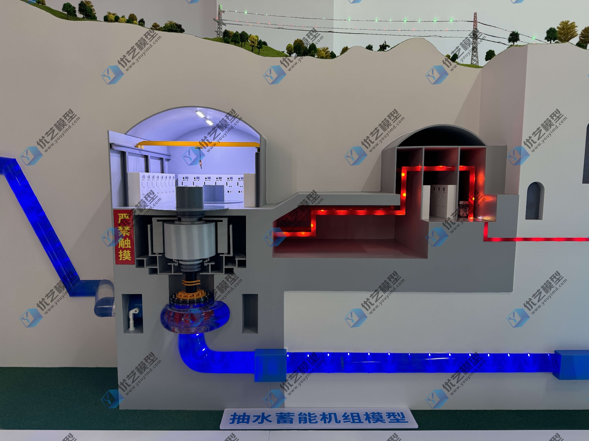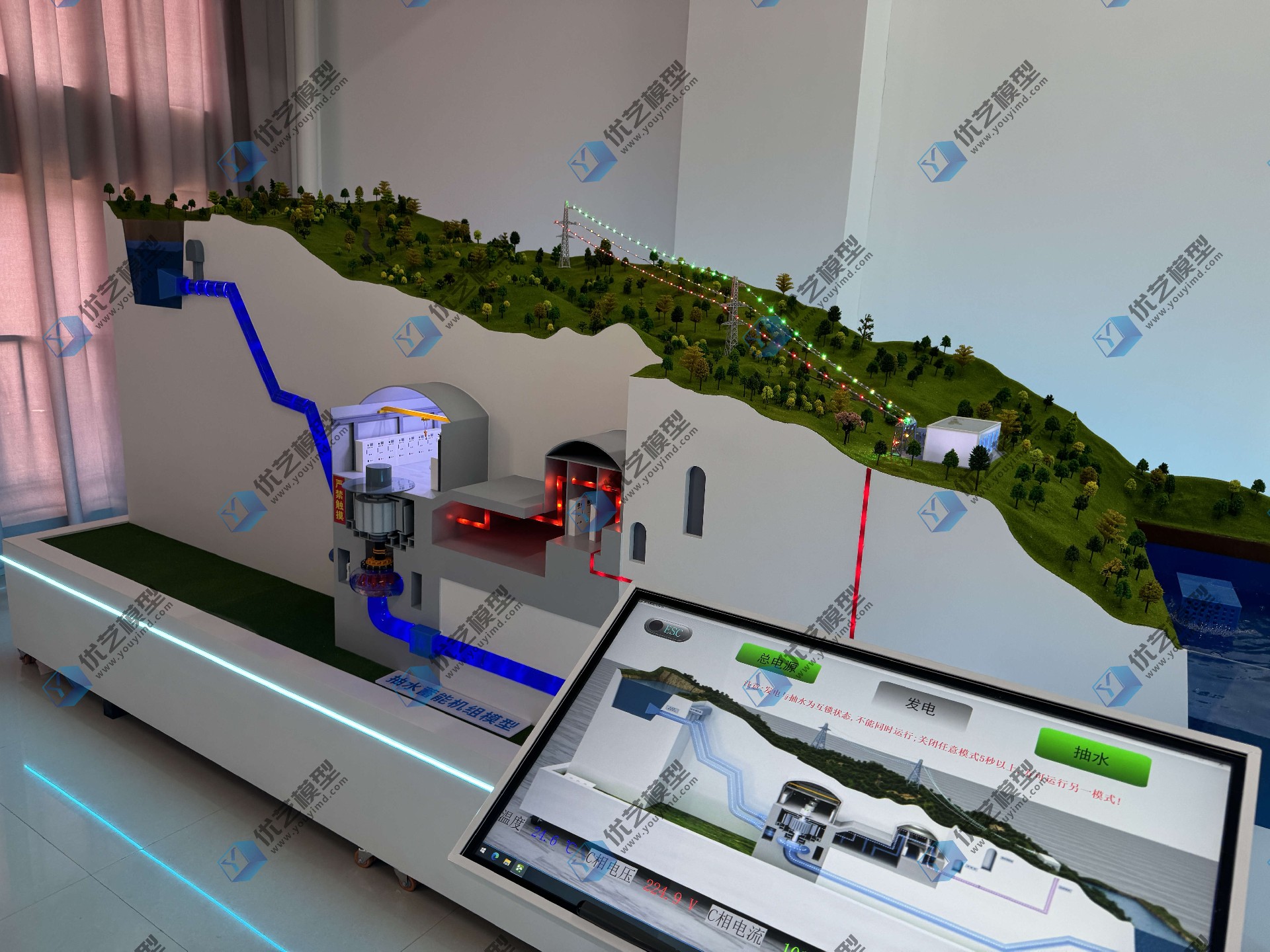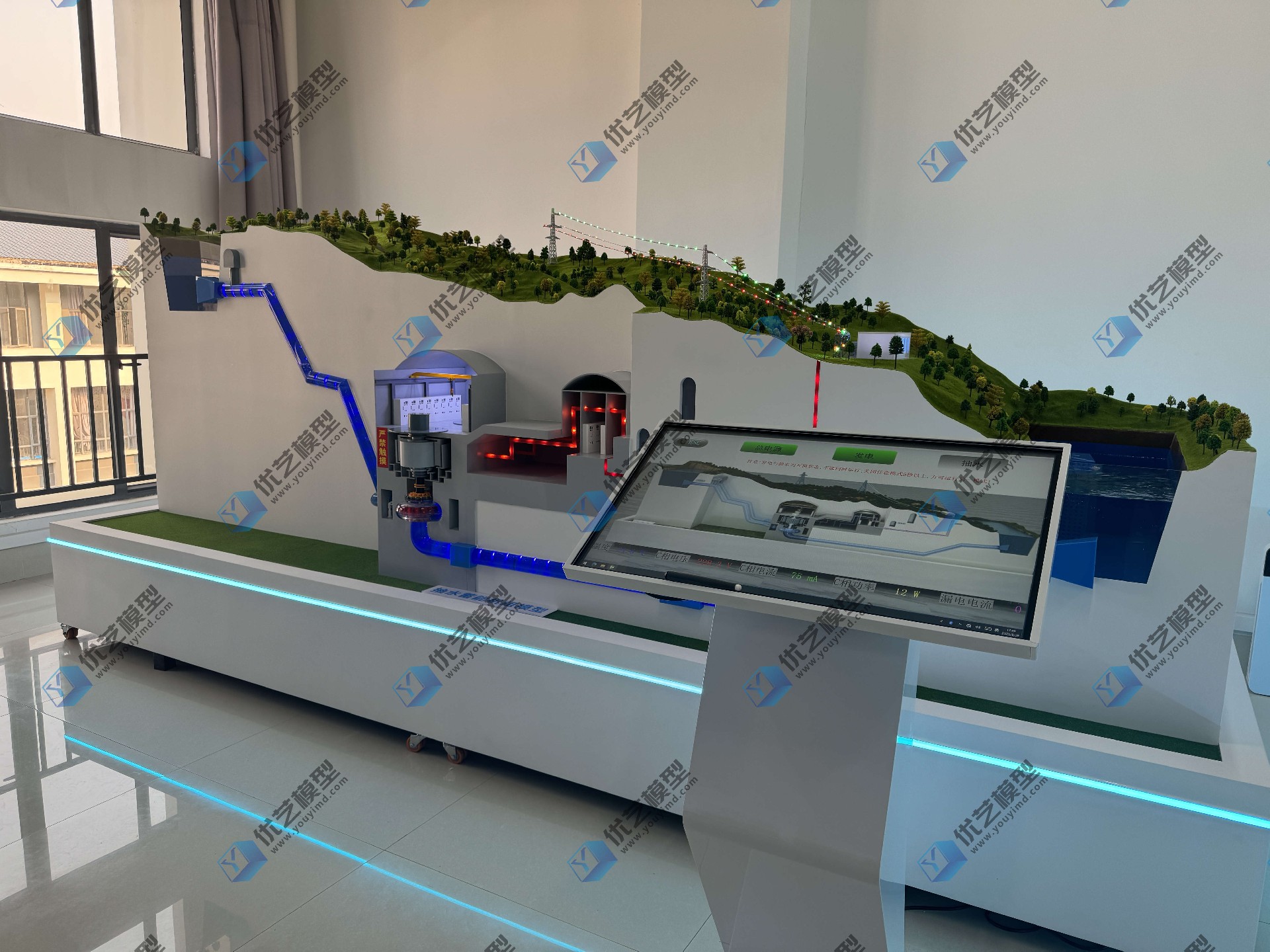 抽水蓄能水電站動(dòng)態(tài)剖面結(jié)構(gòu)仿真教學(xué)模型,是湖南省優(yōu)藝模型根據(jù)業(yè)主需求定制設(shè)備,本模型是一款集教學(xué)演示、技術(shù)培訓(xùn)、科普展覽于一體的高端專業(yè)設(shè)備。其總長(zhǎng)4米,以精確的比例與高度仿真的結(jié)構(gòu),完整揭示了抽水蓄能電站的核心工作原理。模型集成了光電機(jī)械系統(tǒng),由可編程邏輯控制器(PLC)與中央觸控電腦進(jìn)行智能化管理。它能夠生動(dòng)模擬抽水蓄能電站的兩種核心工作狀態(tài):