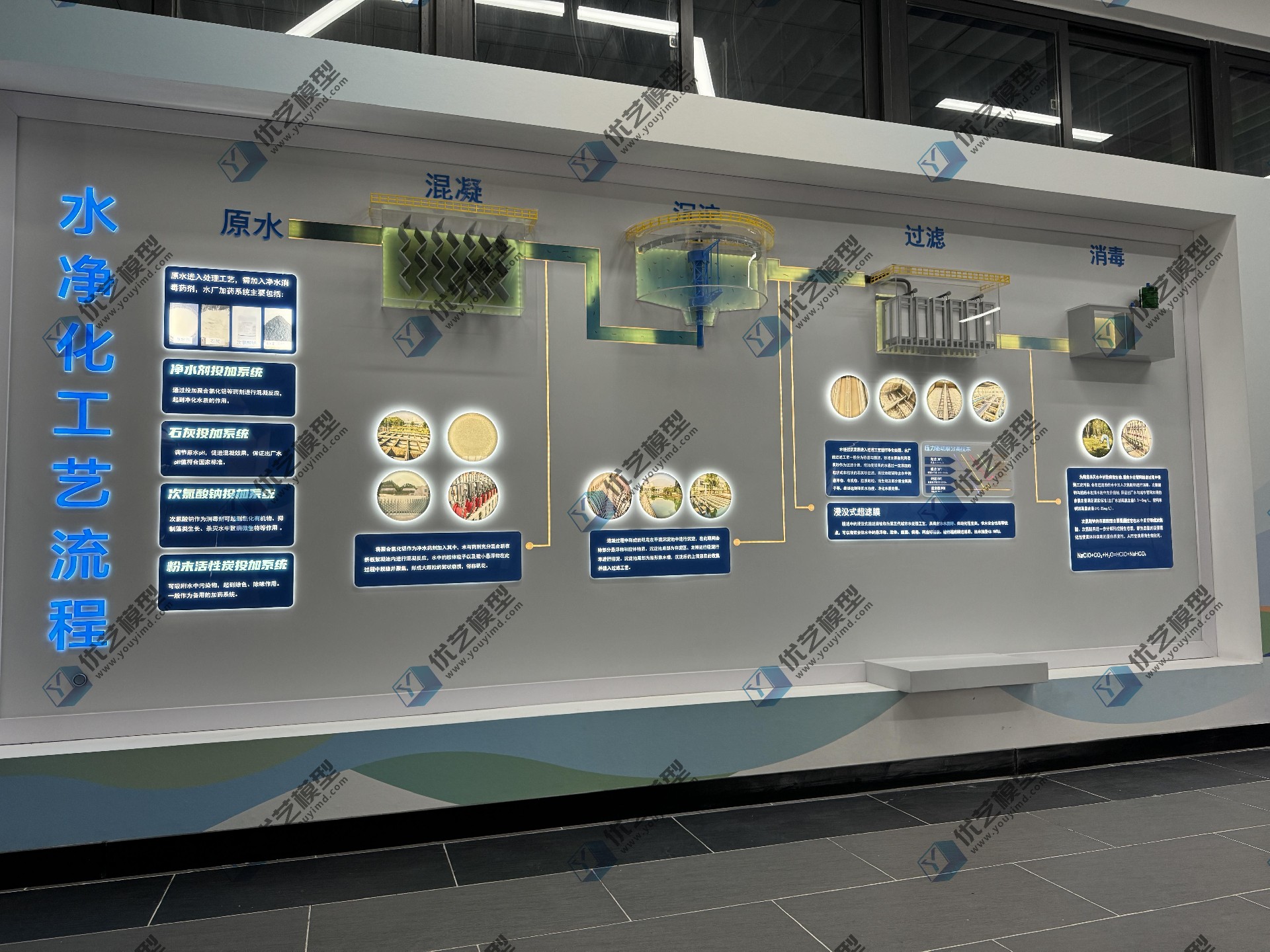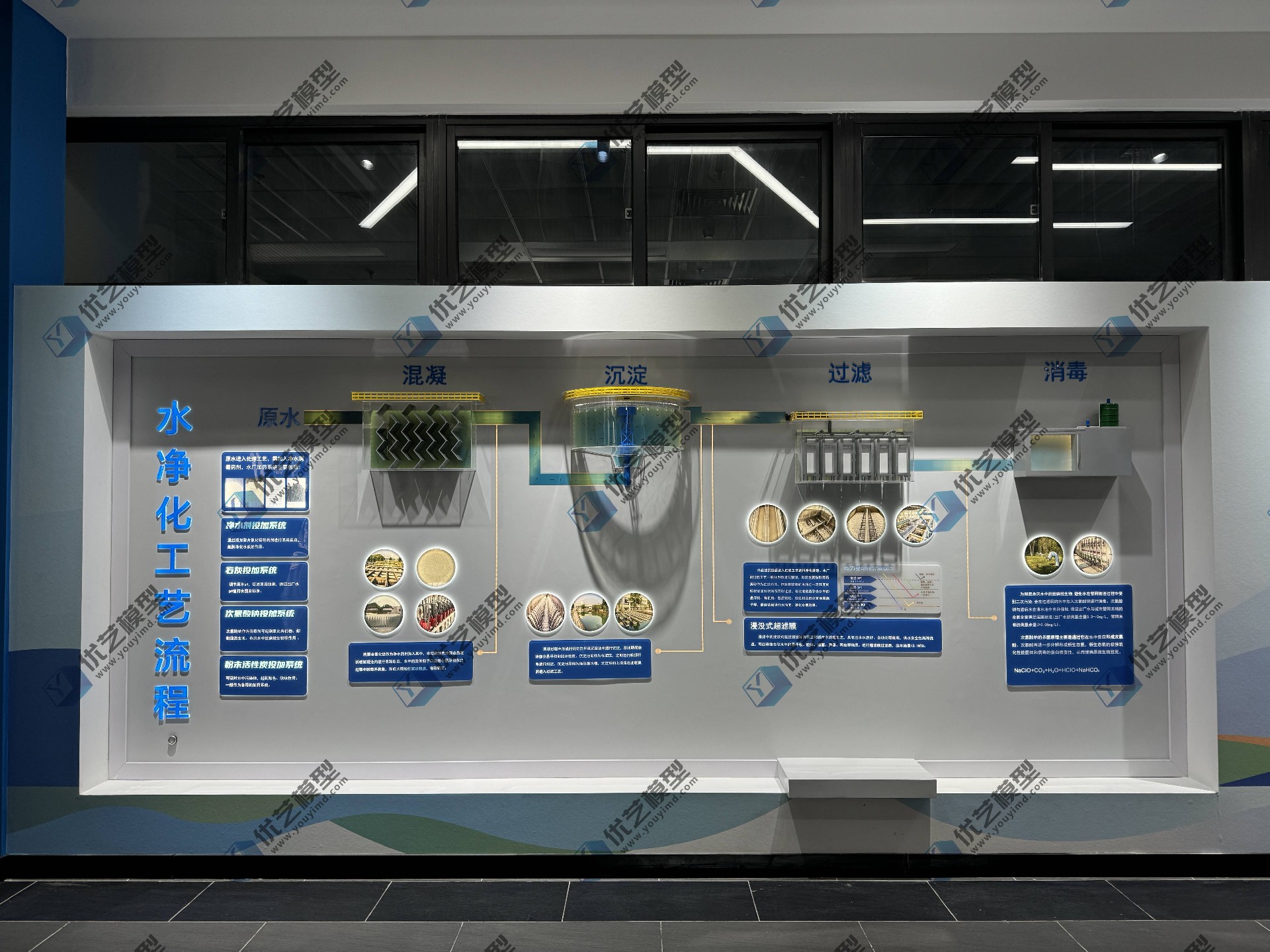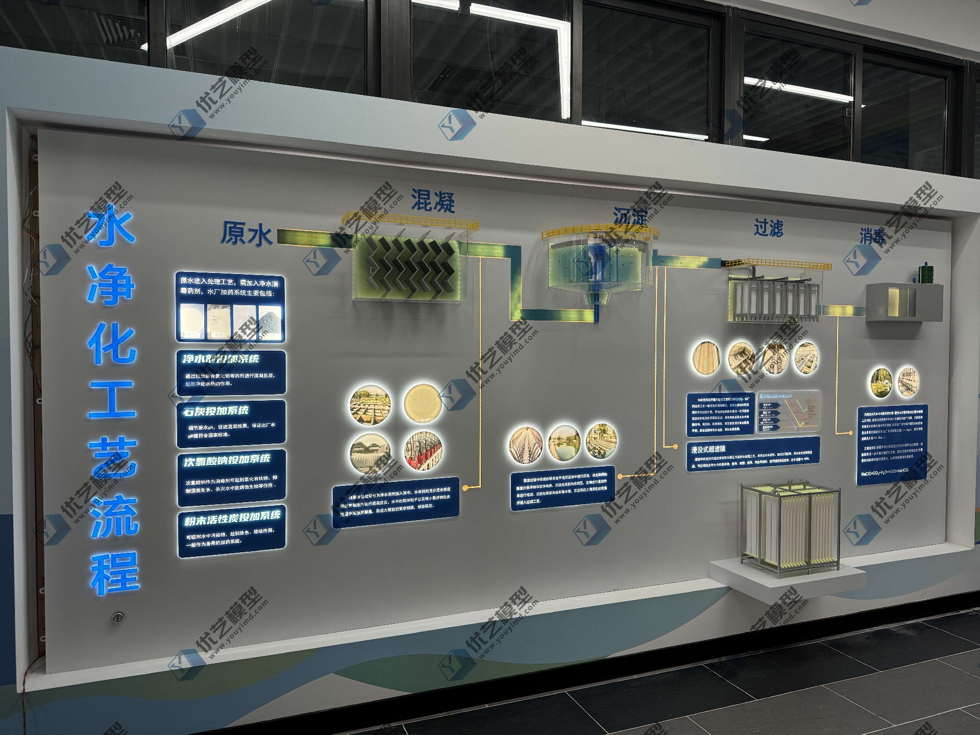 水凈化工藝流程模型,是由湖南省優藝模型有限責任公司根據業主要求,匠心打造的專業科教裝置。模型采用3900mm超長墻面掛板設計,將混凝、沉淀、過濾、消毒四大核心工藝,以立體透明結構全景呈現!每個處理池均采用高透亞克力材質,讓設備內部構造一目了然;創新配備LED流水燈動態系統,生動模擬真實水流動線,如同親眼見證"濁水變清泉"的魔法過程。