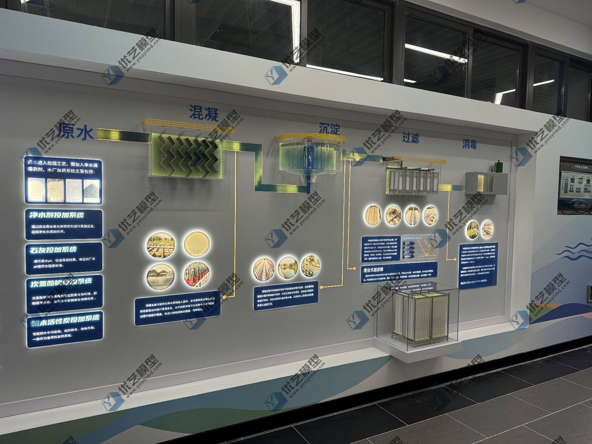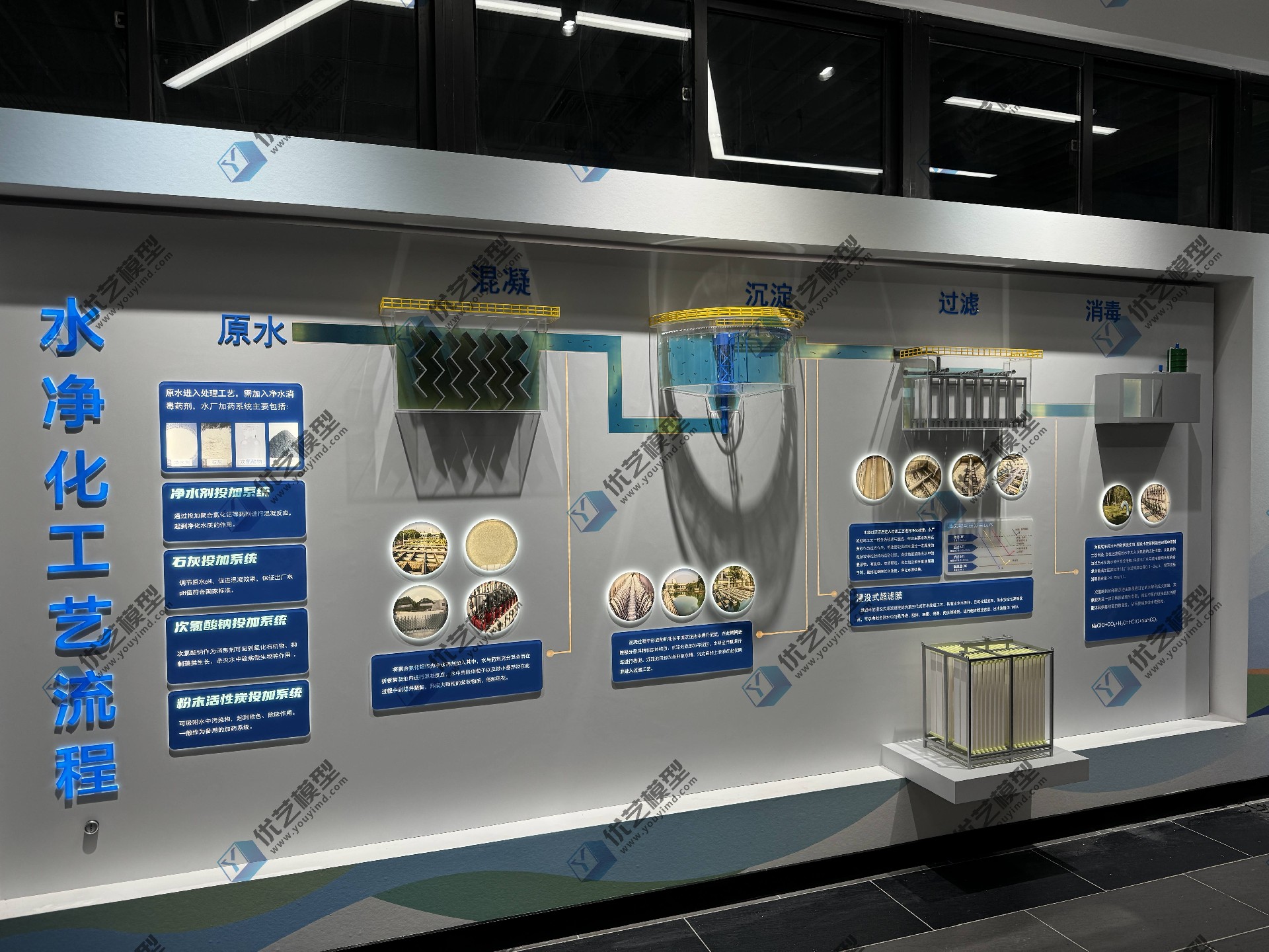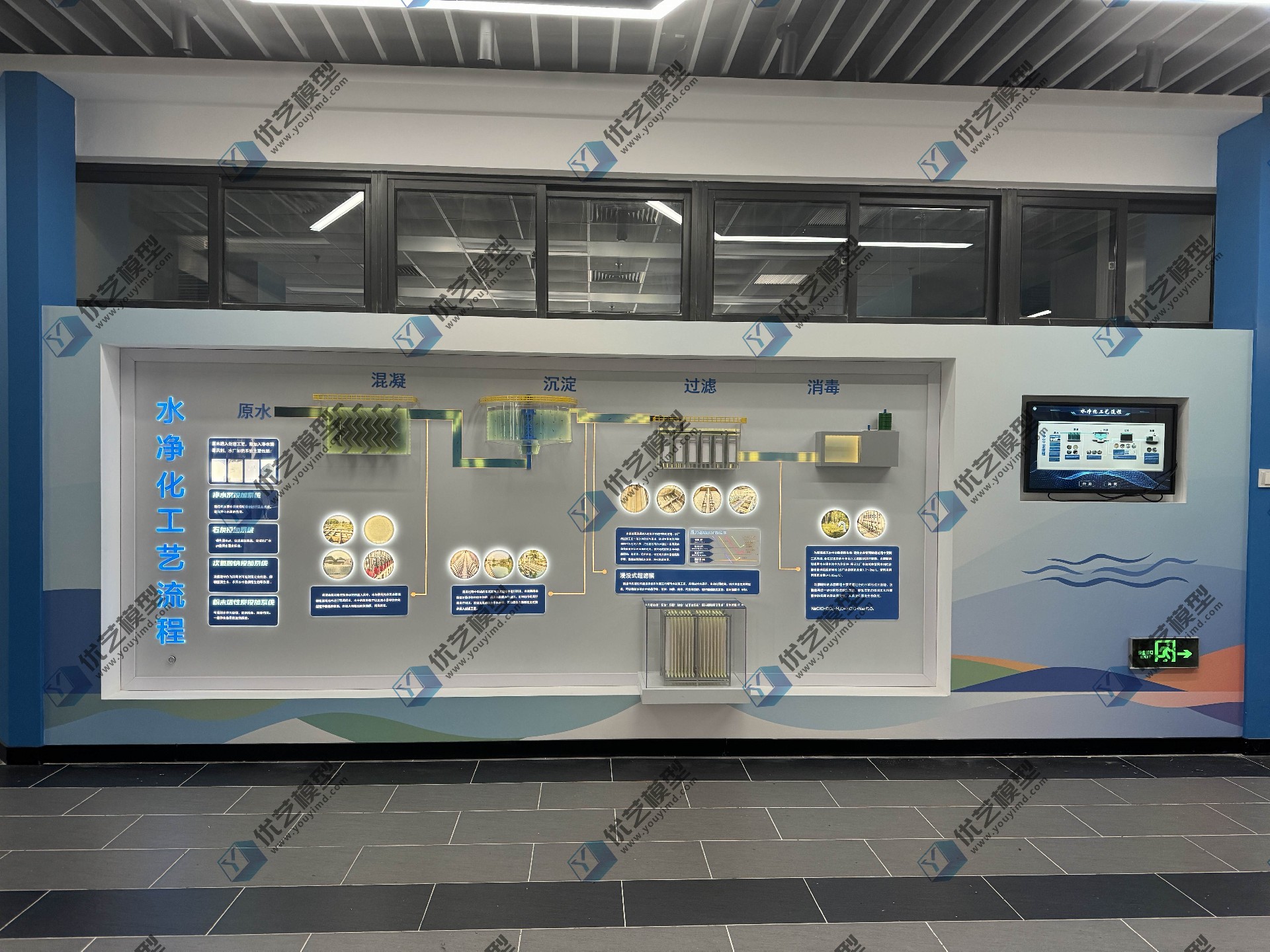 水凈化工藝流程模型,是由湖南省優藝模型有限責任公司根據業主要求,匠心打造的專業科教裝置。模型采用3900mm超長墻面掛板設計,將混凝、沉淀、過濾、消毒四大核心工藝,以立體透明結構全景呈現!每個處理池均采用高透亞克力材質,讓設備內部構造一目了然;創新配備LED流水燈動態系統,生動模擬真實水流動線,如同親眼見證"濁水變清泉"的魔法過程。